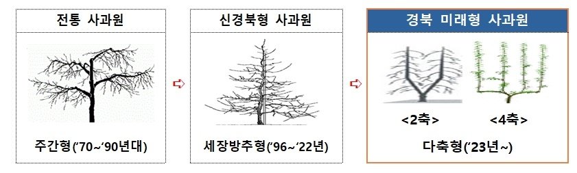 경북도는 경북 미래형 사과원(다축형) 확대 조성에 본격적으로 나선다고 1일 밝혔다.이 같은 추진 배경은 계속되는 농촌인구 감소, 기후변화에 따른 재배 적지 북상, 시장 개방 등 대내외 어려운 여건 상황 속에 기존 사과원(신경북형, 방추형)이 성장 한계에 도달한 것으로 판단하고 있다.