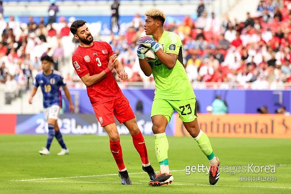 31일 카타르 도하의 앗수마마 스타디움에서 열린 2023 아시아축구연맹(AFC) 카타르 아시안컵 16강전 일본과 바레인의 경기에서 일본 골키퍼 스즈키 자이온이 상대 선수에 앞서 볼을 따내고 있다.