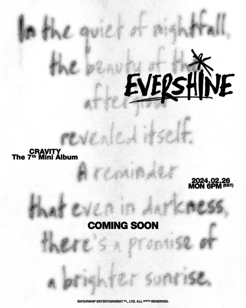 커밍순 이미지에는 앨범명인 '에버샤인'을 비롯해, '2024.02.26 월요일 오후 6시'라는 확정된 컴백 일자를 담았다. 선명하게 적힌 앨범명 뒤에 흐릿하게 의문의 문장들이 적혀 있어 신보에 대한 궁금증을 더했다.