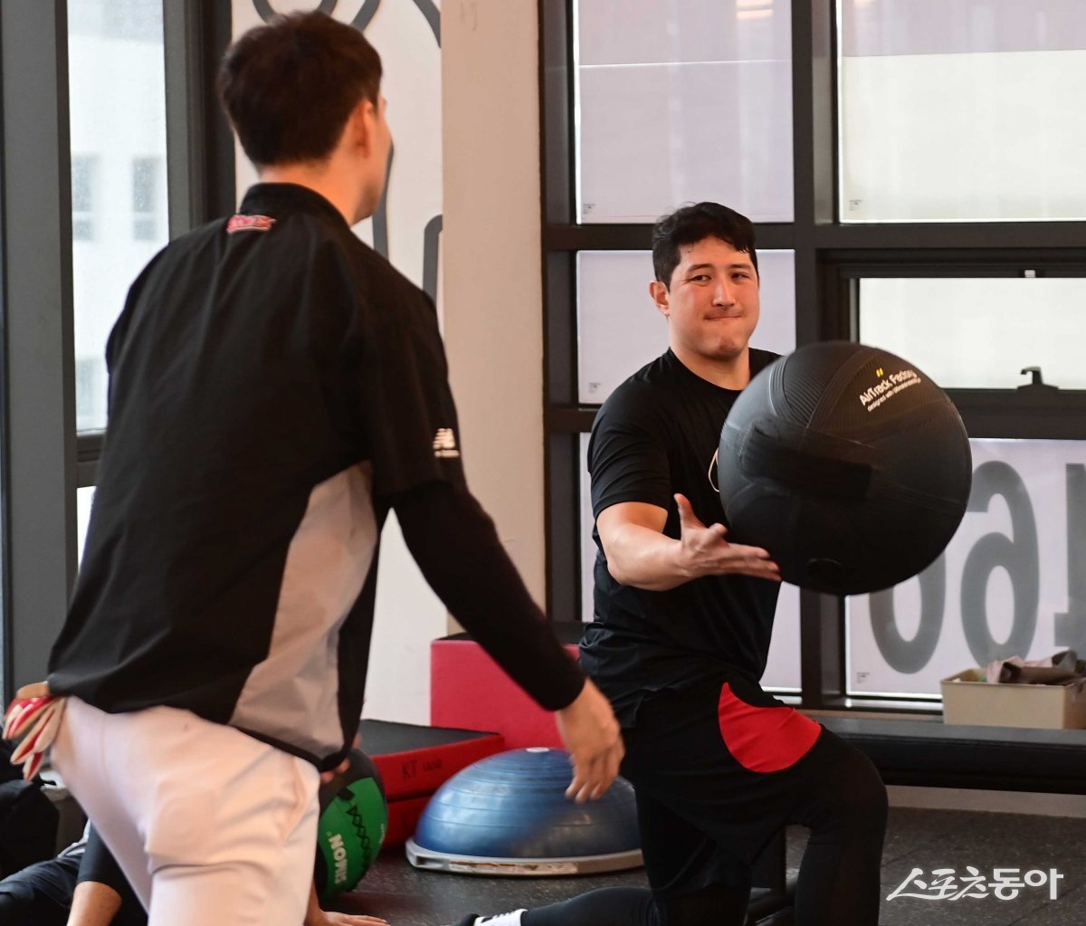 KT 황재균이 5일 부산 기장군 한 헬스장에서 열린 ‘2024 KT 위즈 스프링캠프’에서 웨이트 트레이닝을 하고 있다.