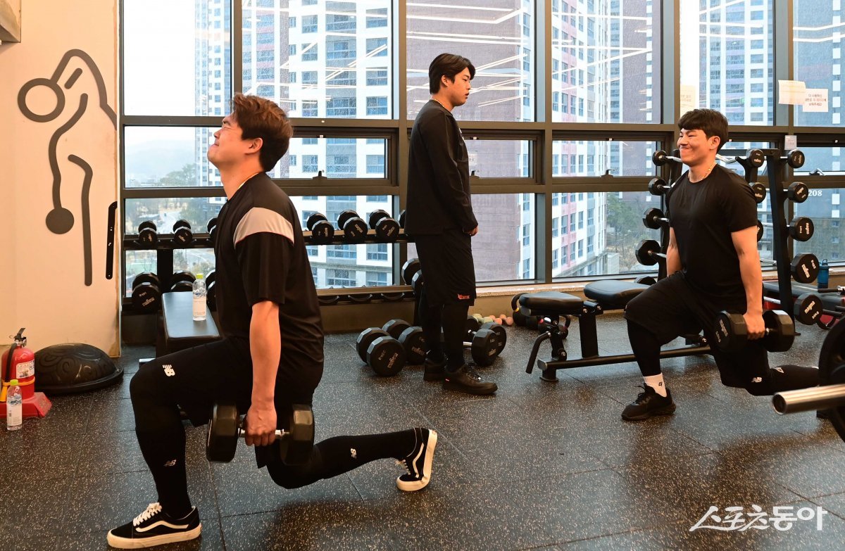 KT 문상철, 강현우가 5일 부산 기장군 한 헬스장에서 열린 ‘2024 KT 위즈 스프링캠프’에서 웨이트 트레이닝을 하고 있다.