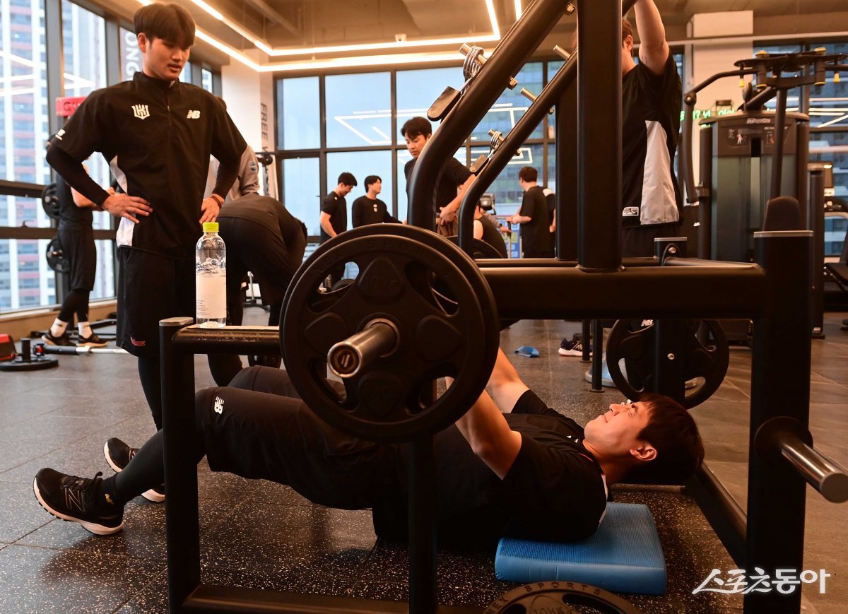 KT 김건형이 5일 부산 기장군 한 헬스장에서 열린 ‘2024 KT 위즈 스프링캠프’에서 웨이트 트레이닝을 하고 있다.