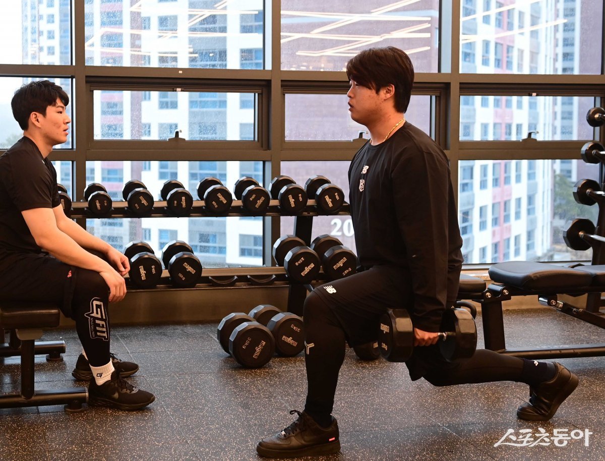 KT 강백호가 5일 부산 기장군 한 헬스장에서 열린 ‘2024 KT 위즈 스프링캠프’에서 웨이트 트레이닝을 하고 있다.