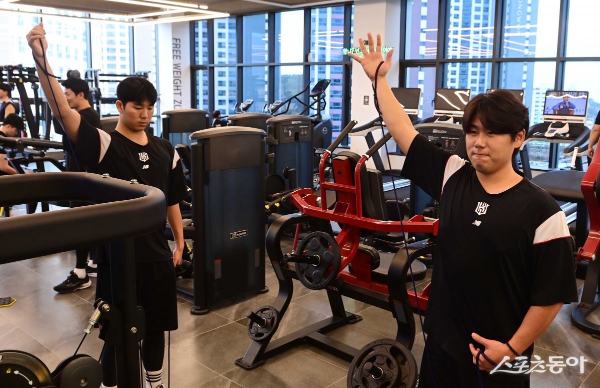 KT 이태규와 문용익이 5일 부산 기장군 한 헬스장에서 열린 ‘2024 KT 위즈 스프링캠프’에서 웨이트 트레이닝을 하고 있다.