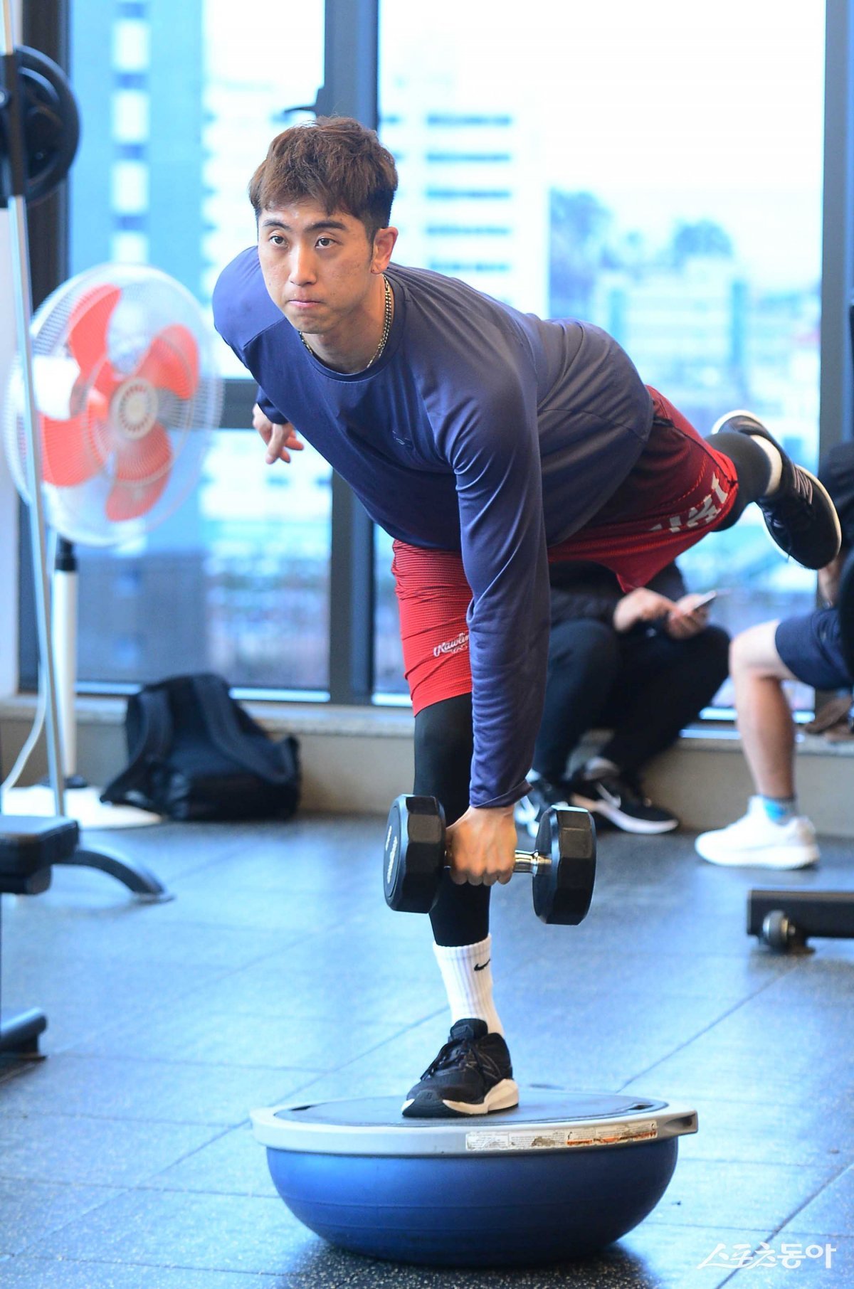 KT 김민수가 5일 부산 기장군 한 헬스장에서 열린 ‘2024 KT 위즈 스프링캠프’에서 웨이트 트레이닝을 하고 있다.