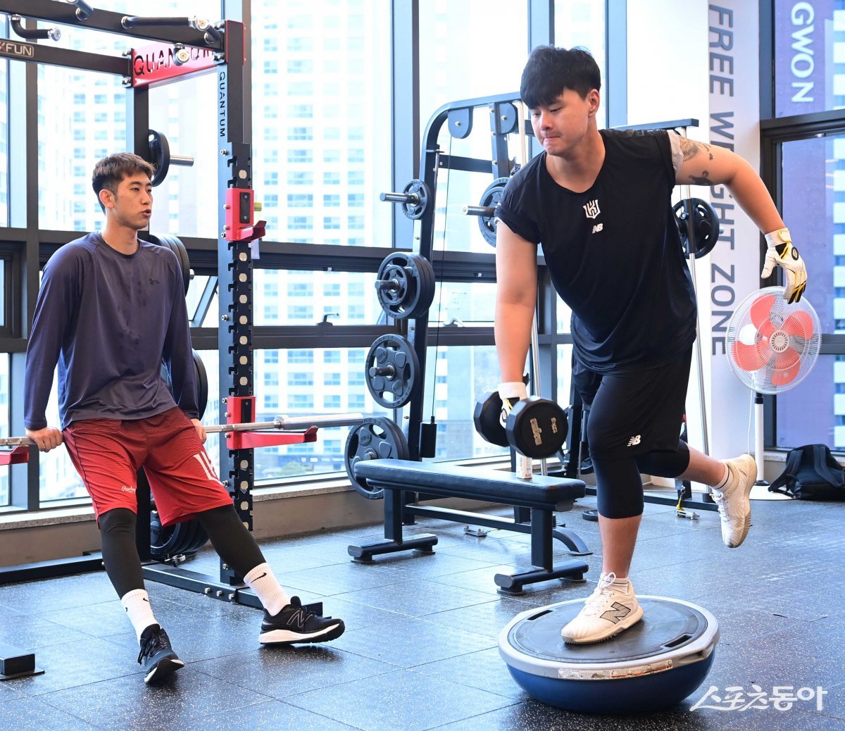 KT 김민이 5일 부산 기장군 한 헬스장에서 열린 ‘2024 KT 위즈 스프링캠프’에서 웨이트 트레이닝을 하고 있다.