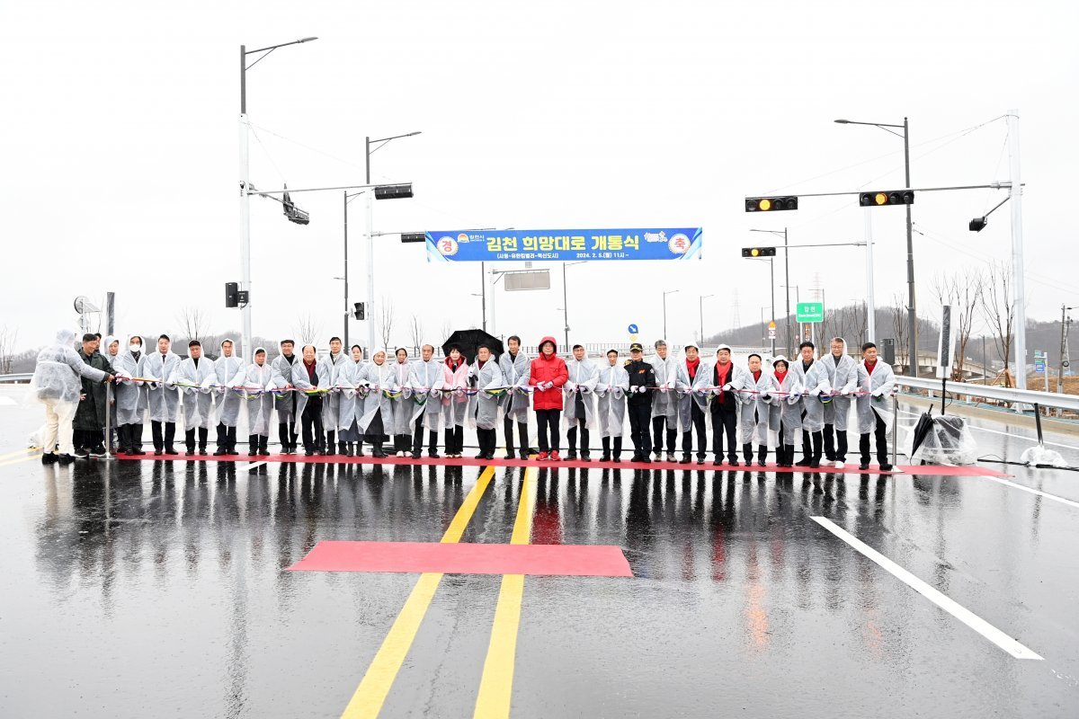 김천시는 5일 시청~유한킴벌리~혁신도시를 연결하는 마지막 구간인 김천 희망대로 개설 공사 개통식을 가졌다.이 노선은 기존 원도심과 혁신도시를 잇는 지방도 514호선의 교통량 증가에 따른 주민들의 교통 불편 해소와 원도심과 신도시의 접근성 향상을 위해 추진했으며, 총연장 L=5.64㎞, 총사업비 1,521억 원을 투입한 단일 시군에서는 초대형 도로개설 사업이다.