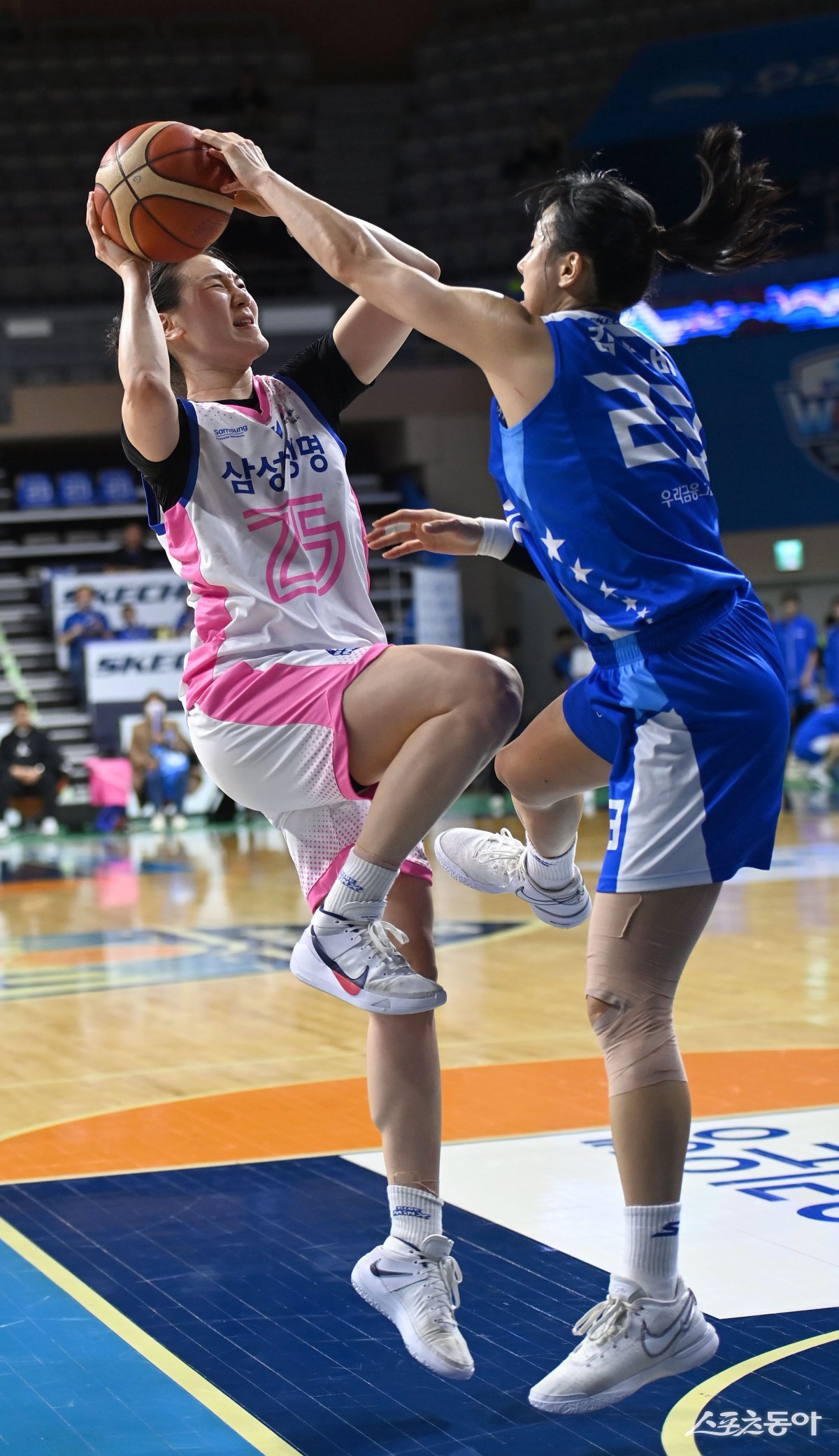 5일 아산이순신체육관에서 열린 ‘우리은행 우리WON 2023~24 여자프로농구’ 우리은행과 삼성생명 경기에서 삼성생명 배혜윤이 우리은행 김단비에게 블록슛을 당하고 있다.