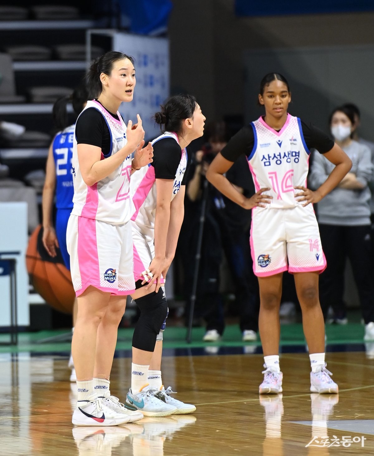 5일 아산이순신체육관에서 열린 ‘우리은행 우리WON 2023~24 여자프로농구’ 우리은행과 삼성생명 경기에서 삼성생명 배혜윤이 파울 판정을 받고 억울해하고 있다.