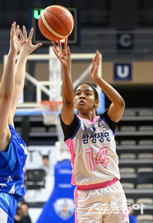 5일 아산이순신체육관에서 열린 ‘우리은행 우리WON 2023~24 여자프로농구’ 우리은행과 삼성생명 경기 연장전에서 삼성생명 키아나 스미스가 결정적인 3점슛을 성공시키고 있다. 아산 | 김종원 기자 won@donga.com
