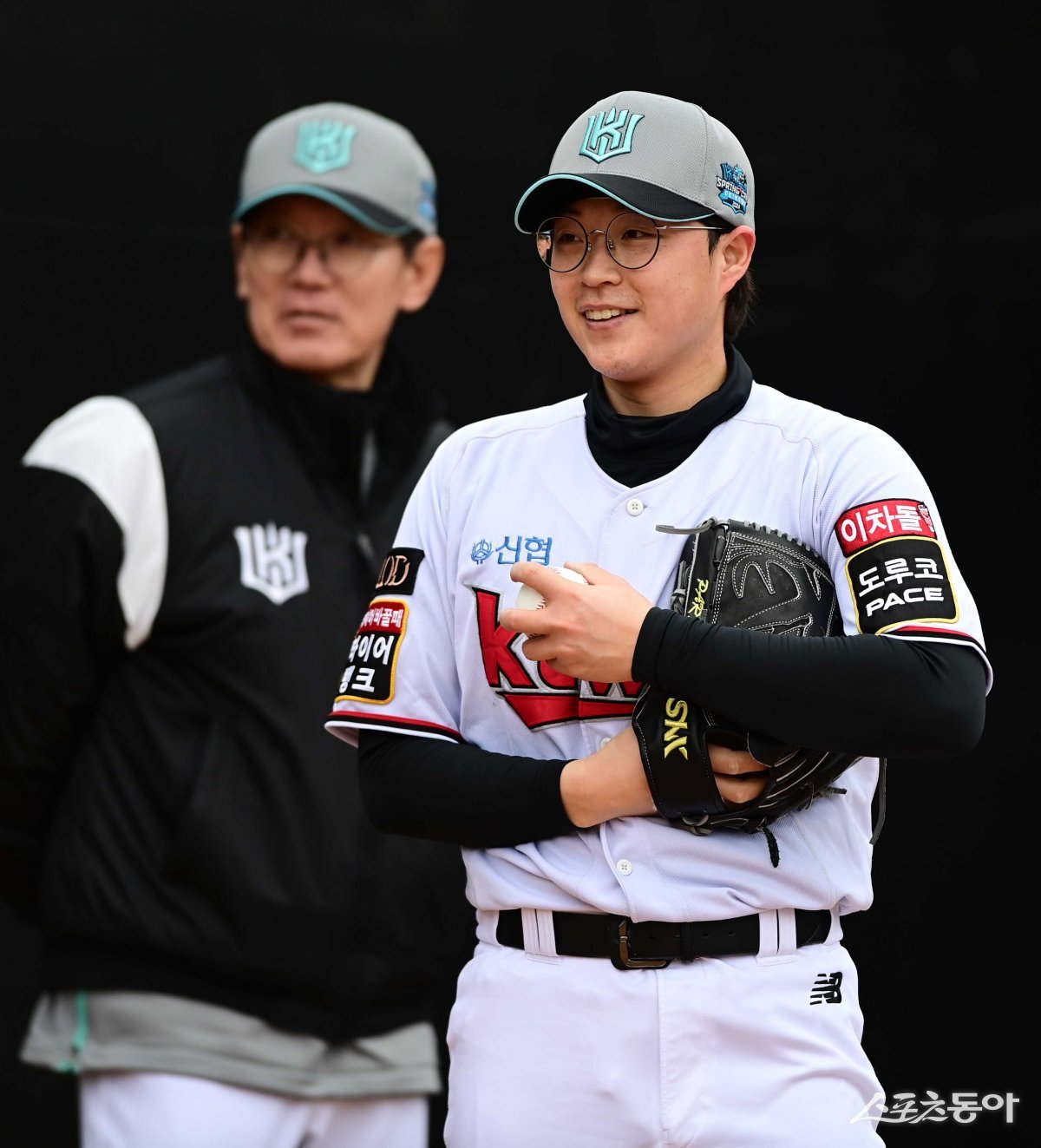 6일 부산 기장현대차드림볼파크에서 열린 ‘2024 KT 위즈 스프링캠프’에서 KT 박세진이 이강철 감독의 칭찬에 웃고 있다.