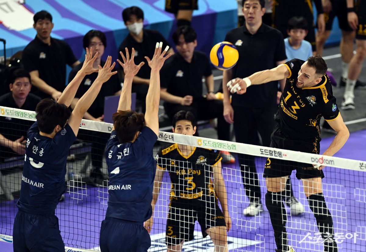 7일 인천 계양체육관에서 ‘2023-2024 도드람 V리그’ 인천 대한항공과 의정부 KB손해보험의 남자부 경기가 열렸다. KB손해보험 비예나가 대한항공 블로커를 피해 스파이크를 날리고 있다.