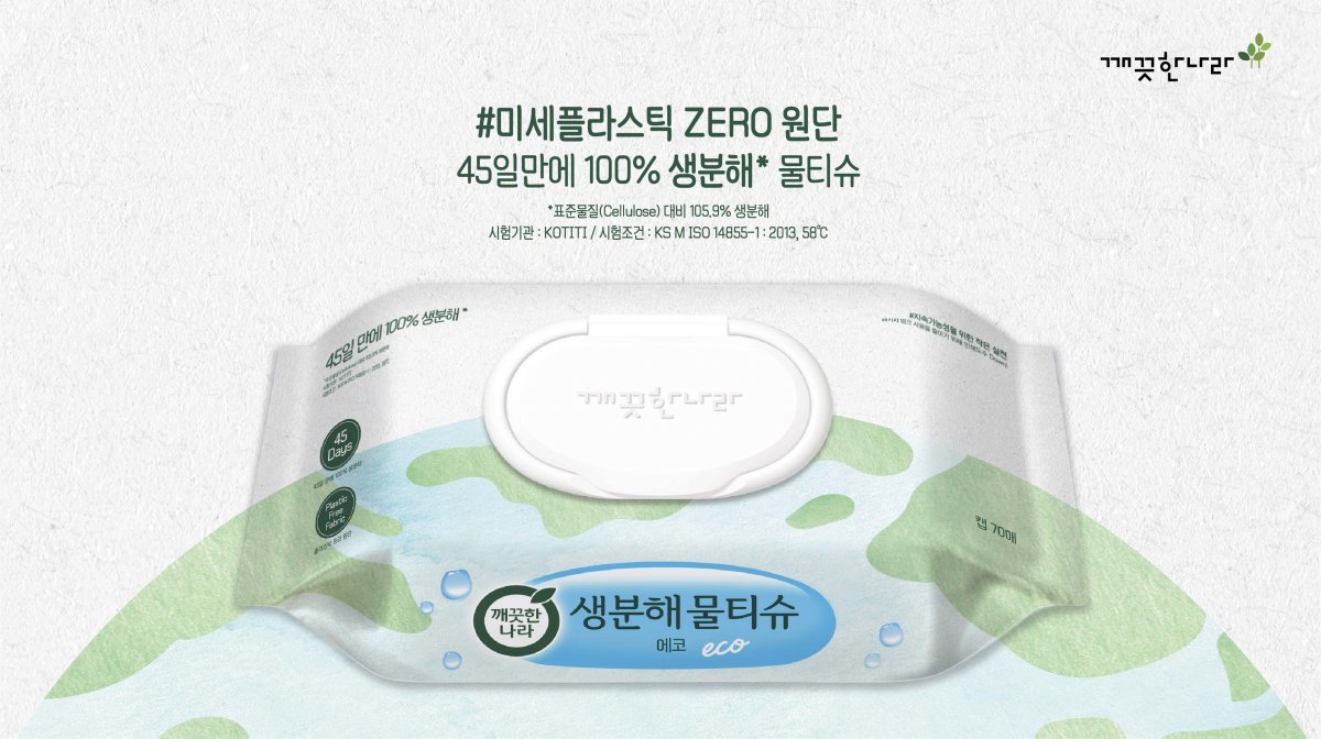 한편 이 회사는 ‘깨끗한나라 생분해 물티슈 에코’를 출시했다. 나무에서 추출한 식물성 레이온을 함유한 원단으로 58℃에서 45일 만에 표준물질 대비 105.9% 생분해가 가능하다. 먹는 물 수준의 10단계 정제 시스템을 통해 안전하게 사용 가능하다. 또 천연 펄프를 함유해 부드러운 사용감을 선사하고, 피부자극 테스트에서 저자극 판정을 받아 예민한 피부도 안심하고 사용할 수 있다.