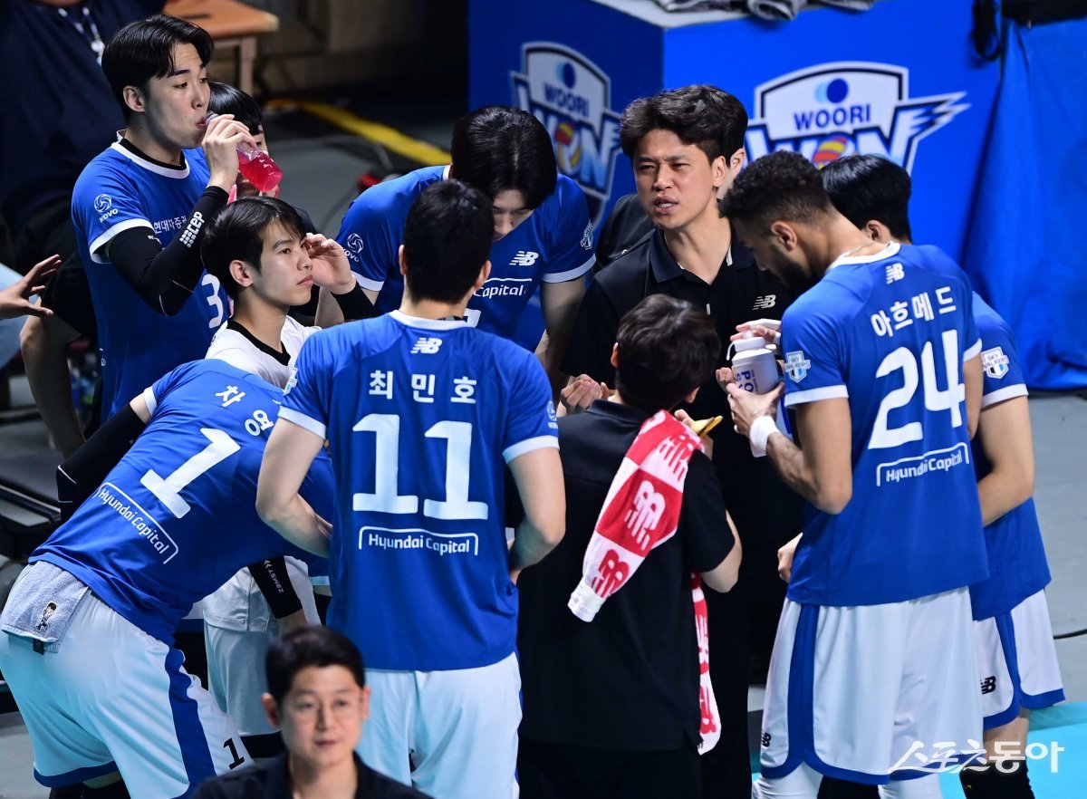 12일 서울 장충체육관에서 열린 ‘도드람 2023-2024 V리그’ 남자부 서울 우리카드와 천안 현대캐피탈의 경기에서 현대캐피탈 진순기 감독대행이 선수들에게 작전 지시를 하고 있다.
