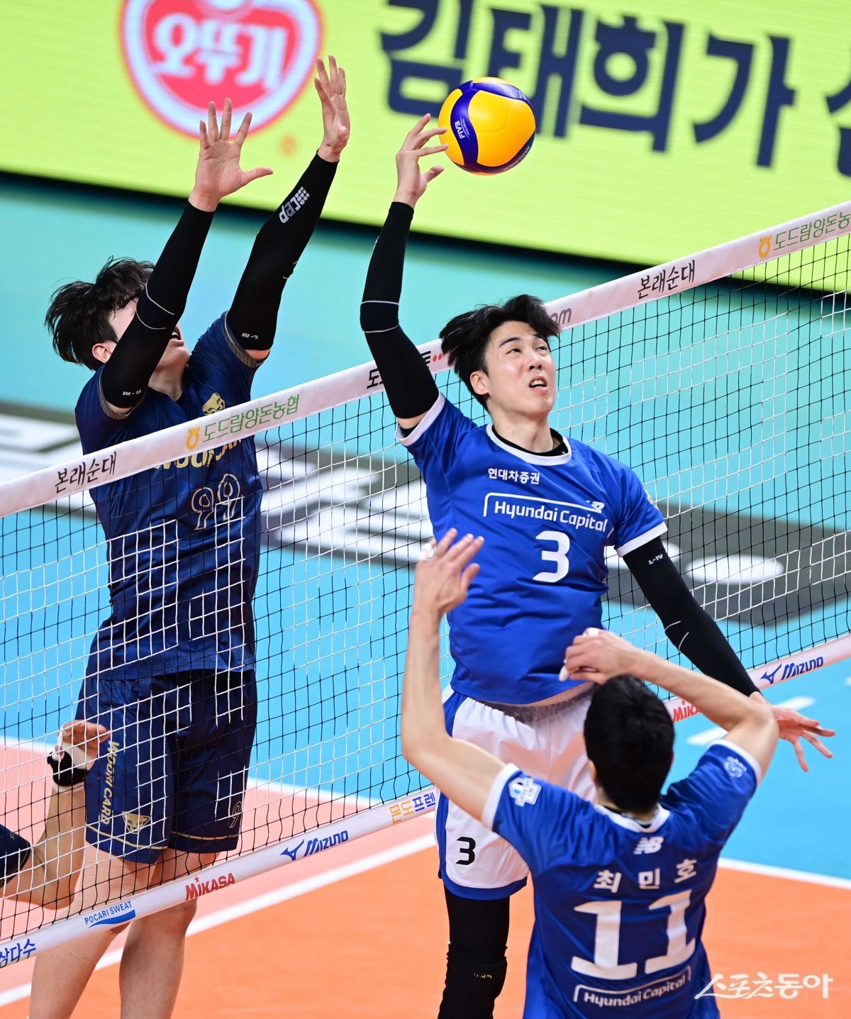 12일 서울 장충체육관에서 열린 ‘도드람 2023-2024 V리그’ 남자부 서울 우리카드와 천안 현대캐피탈의 경기에서 현대캐피탈 김명관이 우리카드 블로커 앞에서 밀어넣기 공격을 하고 있다.