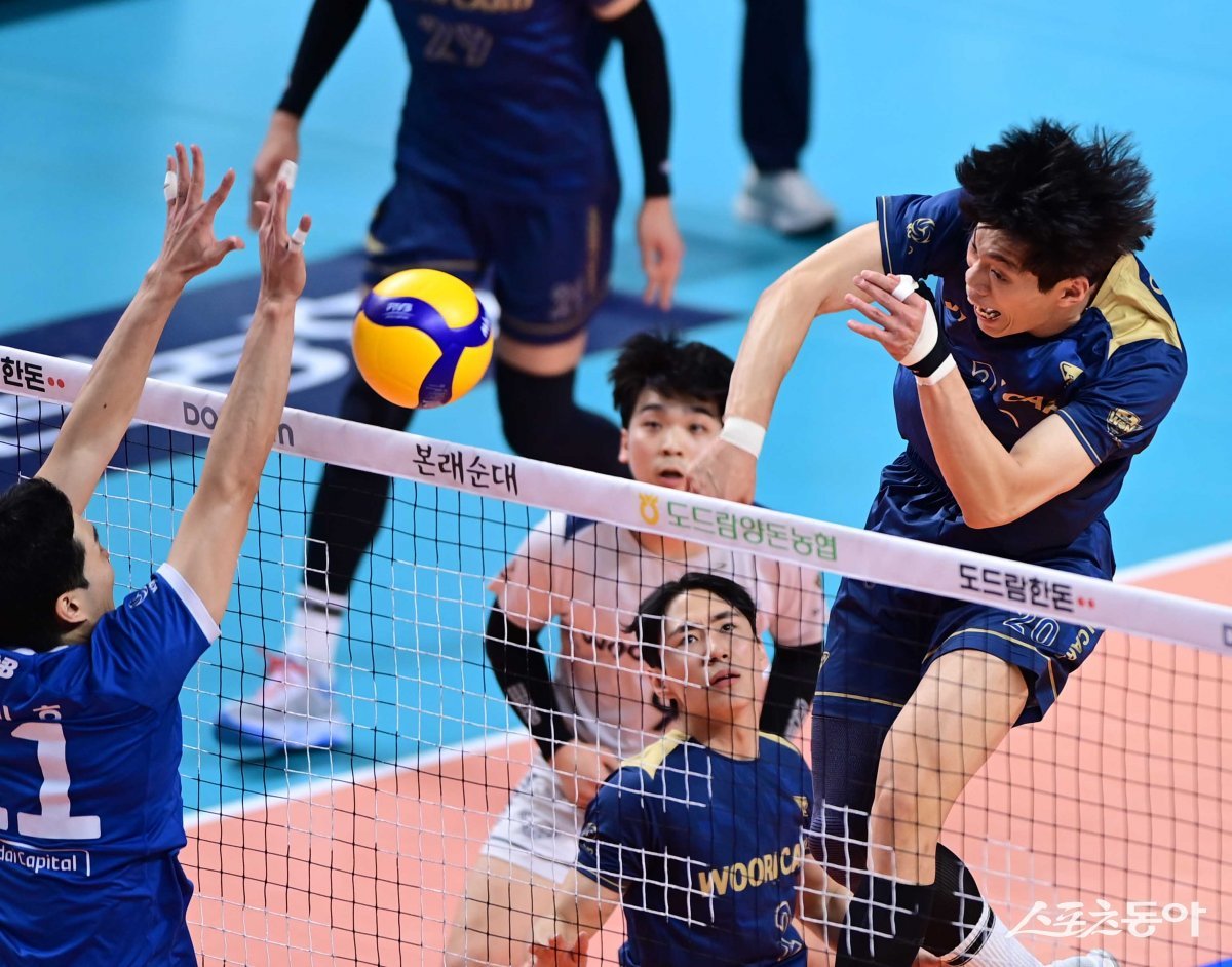 12일 서울 장충체육관에서 열린 ‘도드람 2023-2024 V리그’ 남자부 서울 우리카드와 천안 현대캐피탈의 경기에서 우리카드 이상현이 현대캐피탈 블로커 앞에서 스파이크를 하고 있다.
