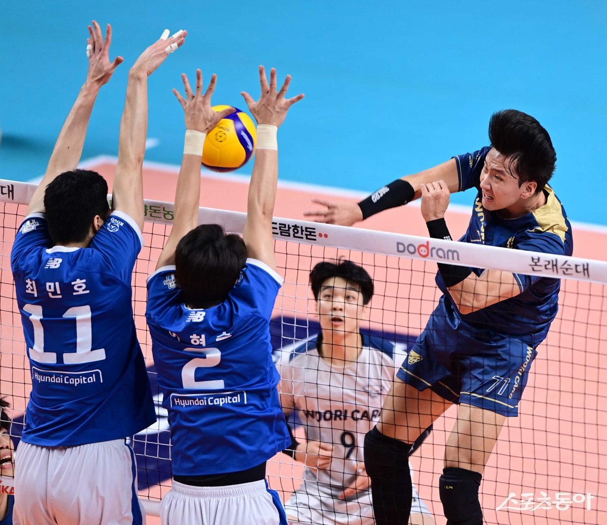 12일 서울 장충체육관에서 열린 ‘도드람 2023-2024 V리그’ 남자부 서울 우리카드와 천안 현대캐피탈의 경기에서 우리카드 송명근이 현대캐피탈 블로커 앞에서 스파이크를 하고 있다.