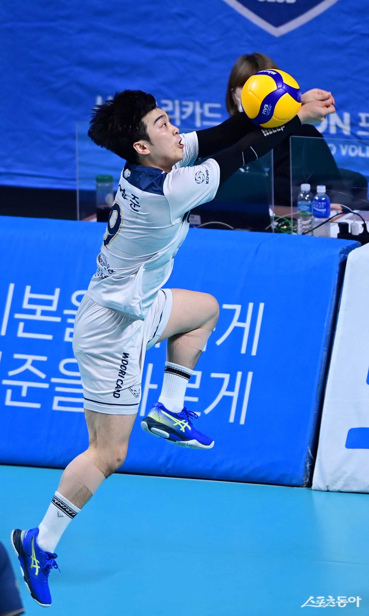 12일 서울 장충체육관에서 열린 ‘도드람 2023-2024 V리그’ 남자부 서울 우리카드와 천안 현대캐피탈의 경기에서 우리카드 김영준이 디그를 하고 있다.