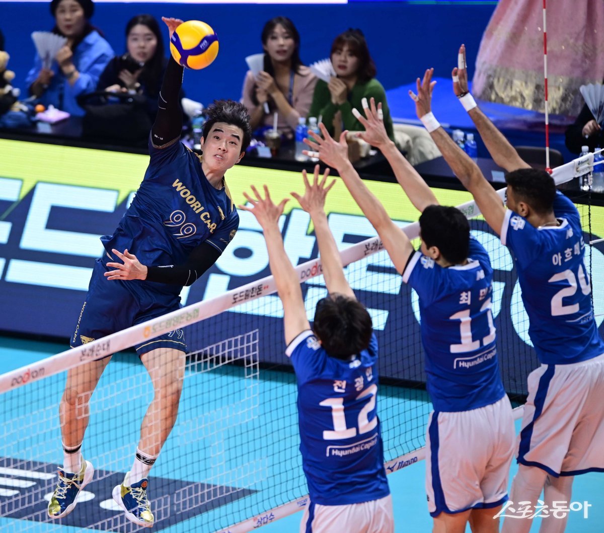 12일 서울 장충체육관에서 열린 ‘도드람 2023-2024 V리그’ 남자부 서울 우리카드와 천안 현대캐피탈의 경기에서 우리카드 김지한이 현대캐피탈 블로커 앞에서 스파이크를 하고 있다.
