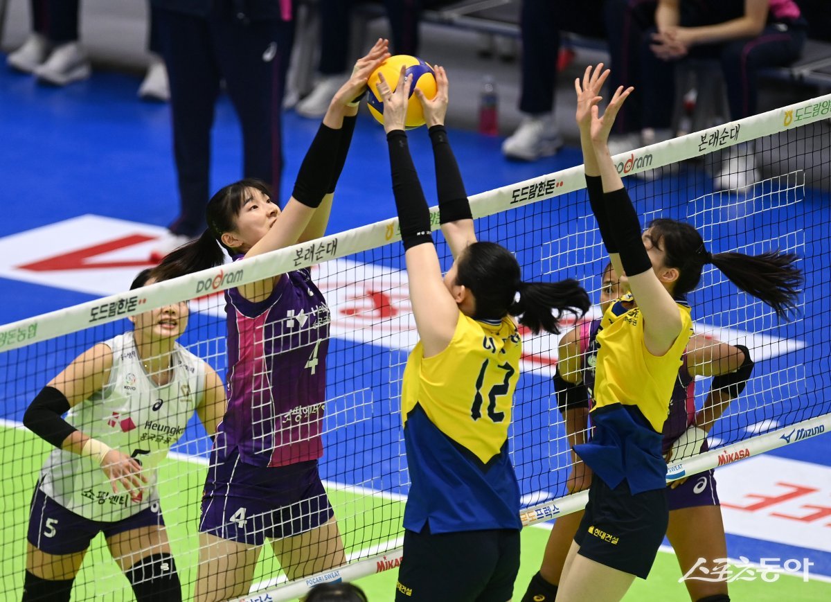 12일 수원체육관에서 열린 ‘도드람 2023~2024 V-리그’ 여자부 현대건설과 흥국생명 경기에서 흥국생명 이주아가 현대건설의 블로킹 사이로 밀어넣기 공격을 하고 있다.