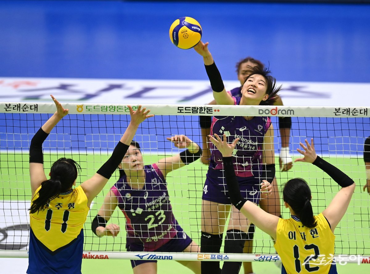 12일 수원체육관에서 열린 ‘도드람 2023~2024 V-리그’ 여자부 현대건설과 흥국생명 경기에서 흥국생명 이주아가 현대건설의 블로킹 사이로 스파이크를 날리고 있다.
