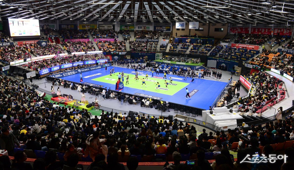 12일 수원체육관에서 열린 ‘도드람 2023~2024 V-리그’ 여자부 현대건설과 흥국생명 경기가 만원 관중이 입장한 가운데 진행되고 있다.