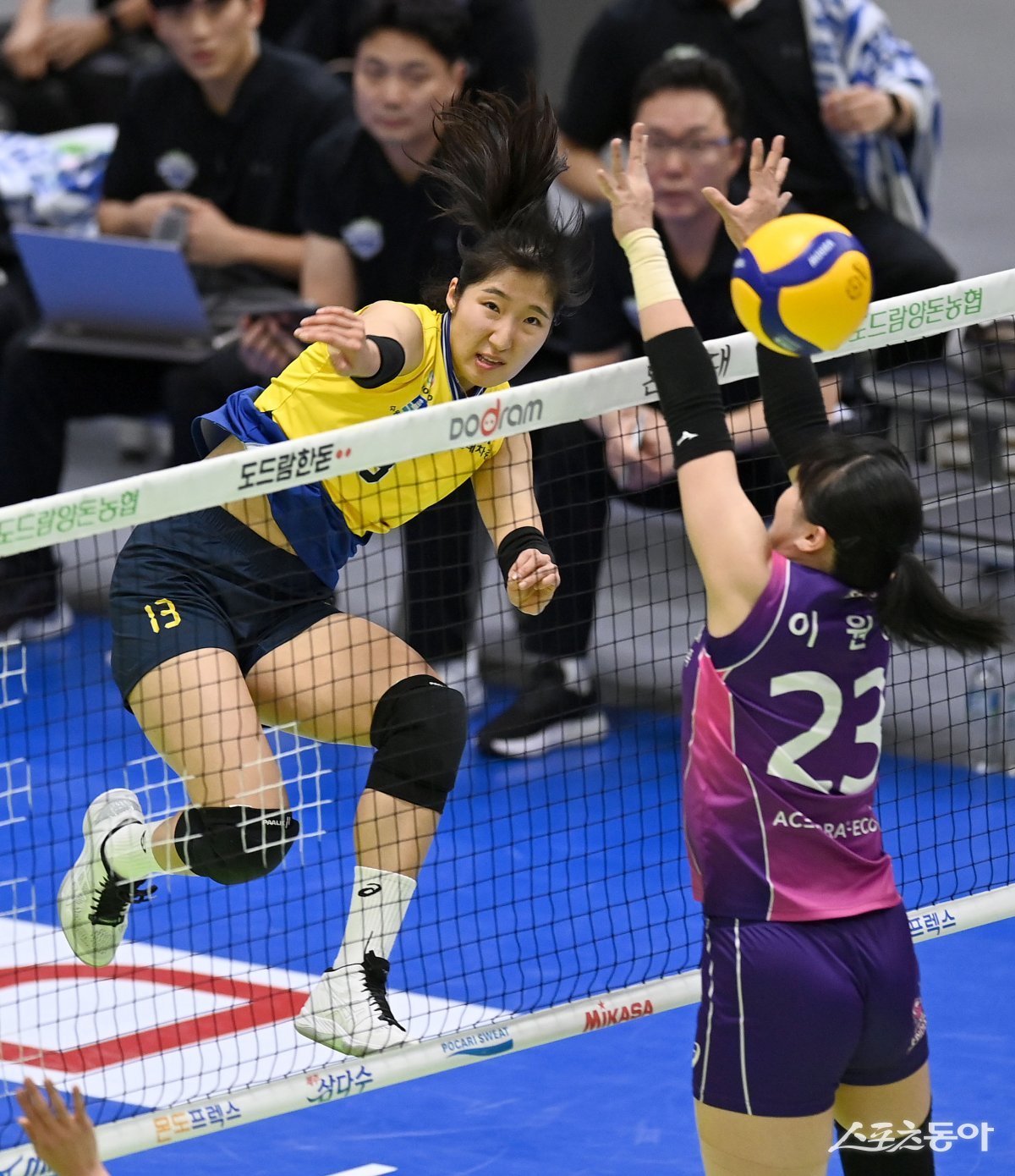 12일 수원체육관에서 열린 ‘도드람 2023~2024 V-리그’ 여자부 현대건설과 흥국생명 경기에서 현대건설 정지윤이 흥국생명의 블로킹 사이로 스파이크를 날리고 있다.