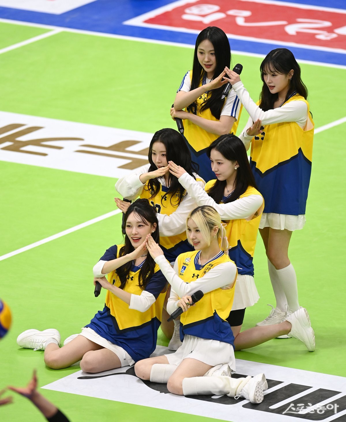 12일 수원체육관에서 열린 ‘도드람 2023~2024 V-리그’ 여자부 현대건설과 흥국생명 경기에서 걸그룹 드림노트가 공연을 하고 있다.