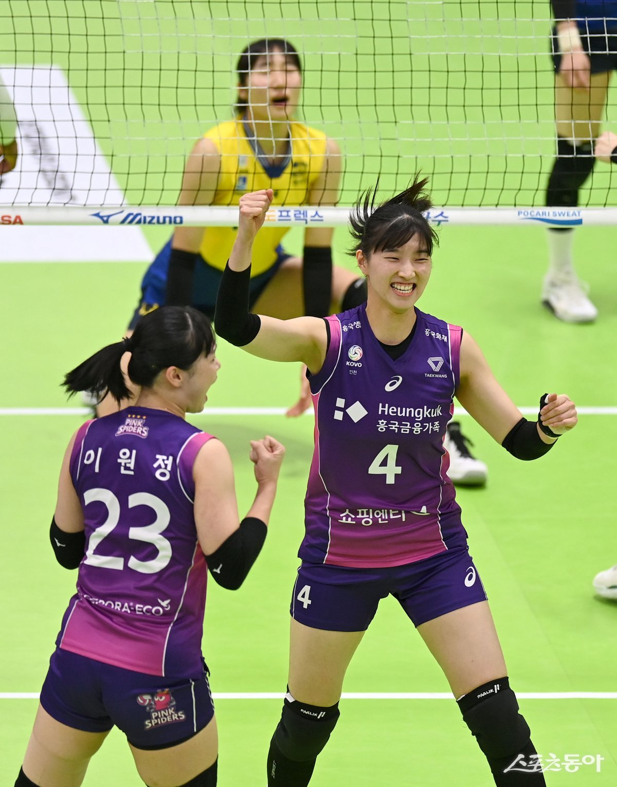 12일 수원체육관에서 열린 ‘도드람 2023~2024 V-리그’ 여자부 현대건설과 흥국생명 경기에서 흥국생명 이주아가 블로킹 득점에 성공한 후 기뻐하고 있다.
