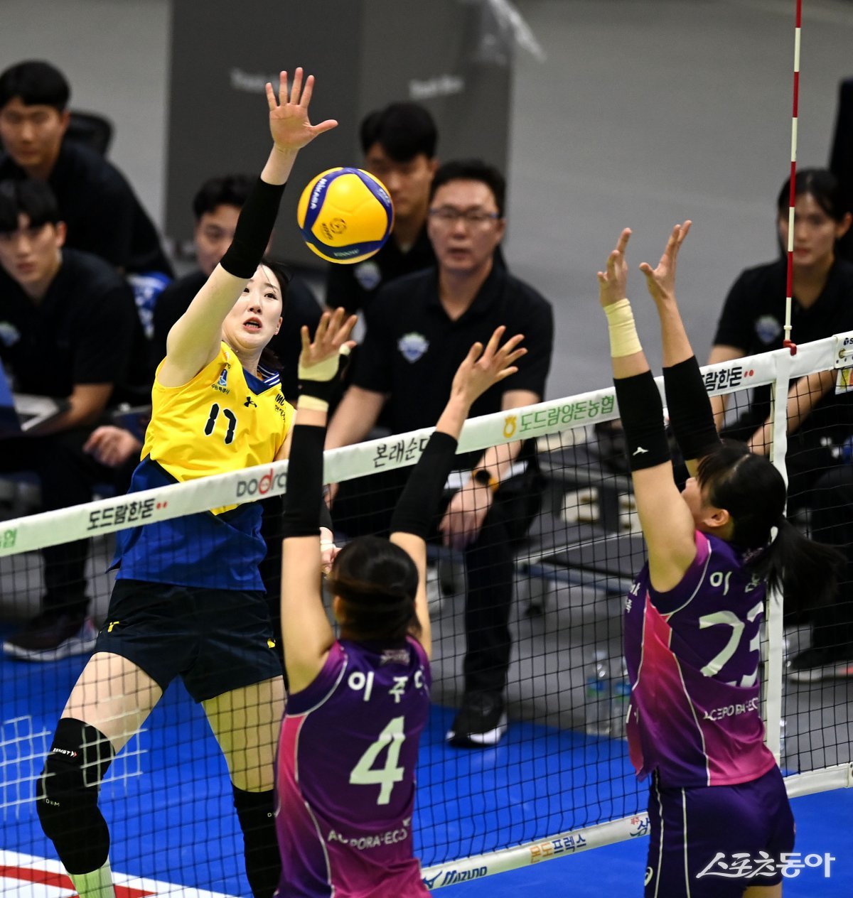 12일 수원체육관에서 열린 ‘도드람 2023~2024 V-리그’ 여자부 현대건설과 흥국생명 경기에서 현대건설 고예림이 흥국생명의 블로킹 사이로 스파이크를 날리고 있다.