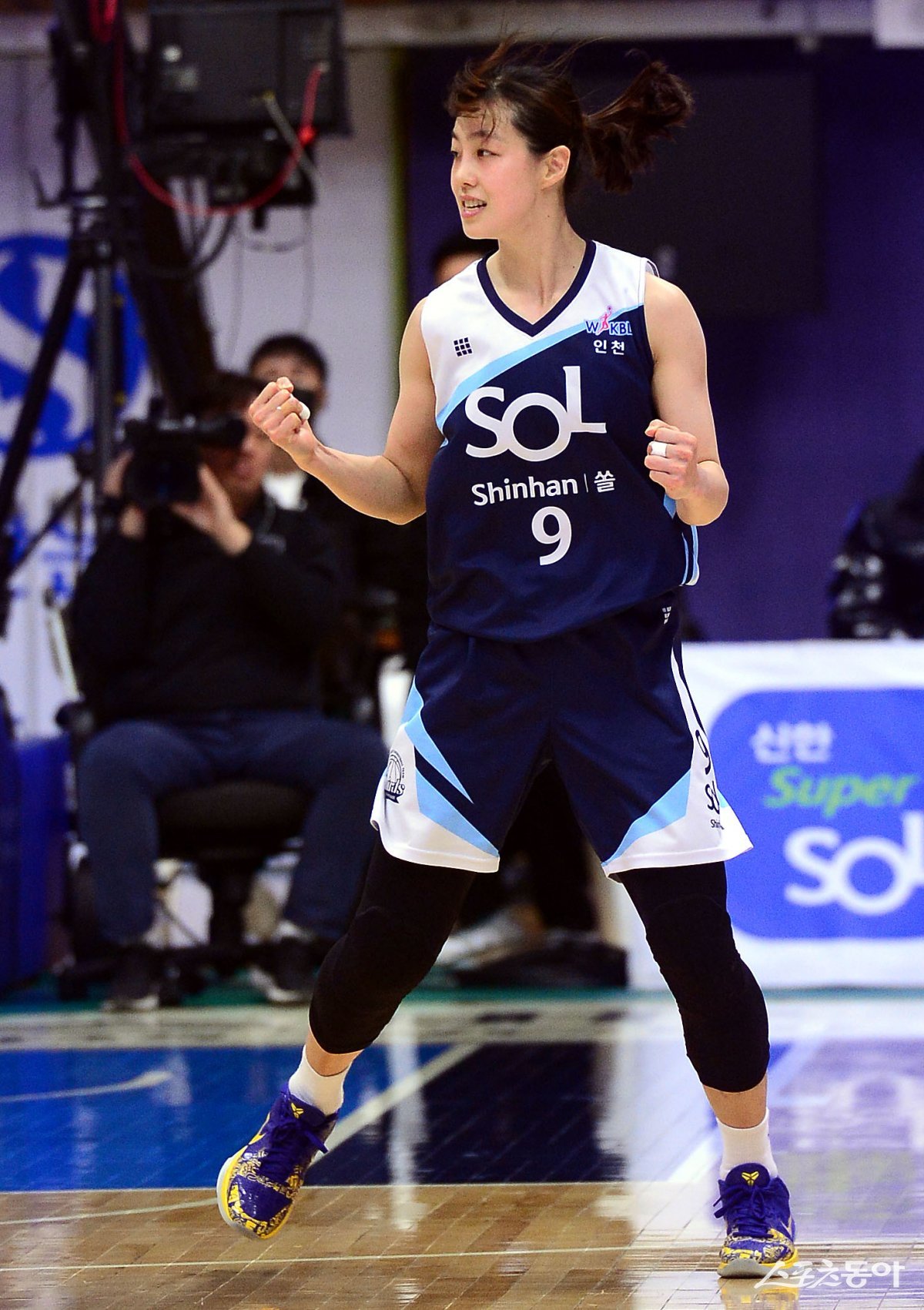 12일 인천 도원체육관에서 열린 ‘우리은행 우리 WON 2023-2024 여자프로농구’ 인천 신한은행과 부천 하나원큐의 경기에서 신한은행 이경은이 득점을 올린 후 주먹을 쥐며 환호하고 있다.