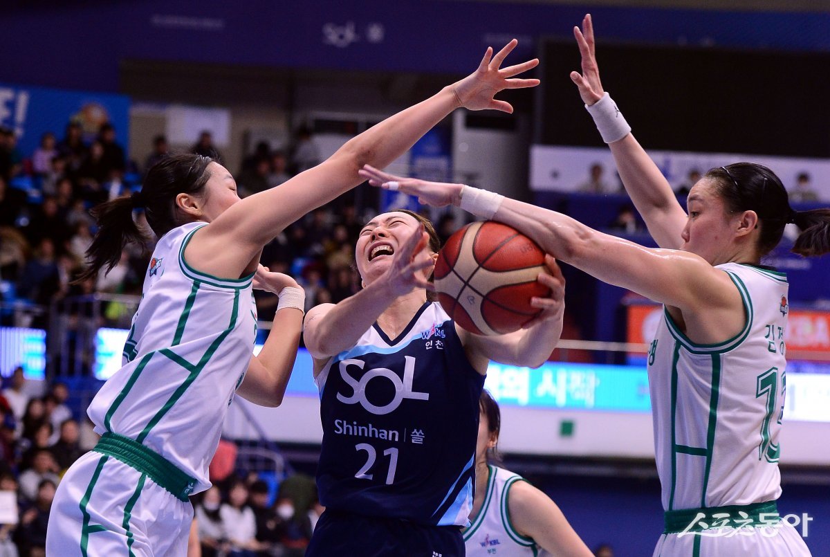 12일 인천 도원체육관에서 열린 ‘우리은행 우리 WON 2023-2024 여자프로농구’ 인천 신한은행과 부천 하나원큐의 경기에서 신한은행 김진영이 슛을 시도했으나 하나원큐 정예림, 김정은의 수비에 막히고 있다.