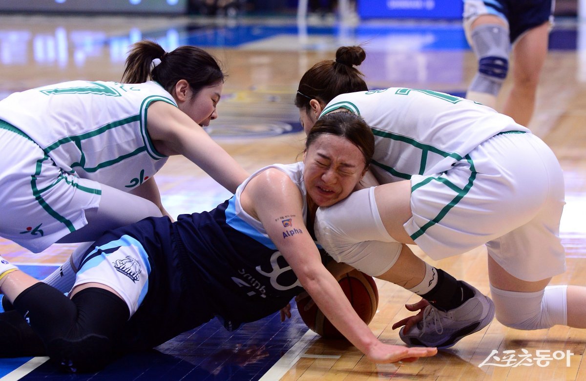 12일 인천 도원체육관에서 열린 ‘우리은행 우리 WON 2023-2024 여자프로농구’ 인천 신한은행과 부천 하나원큐의 경기에서 신한은행 김진영과 하나원큐 김시온, 양인영이 볼 다툼을 벌이고 있다.