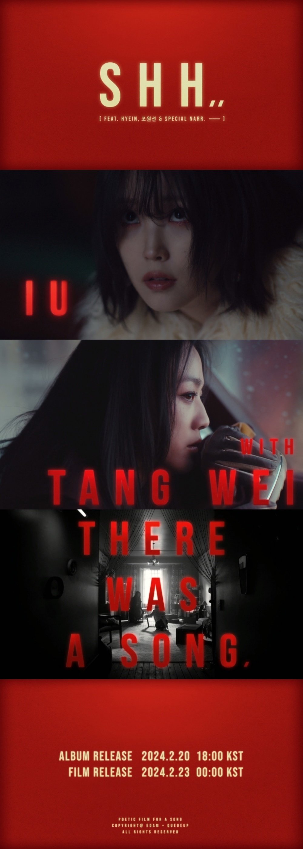 공개된 티저는 붉은 배경에 SHH,,라는 글자가 띄워지는 것으로 시작한다. 아이유는 흑발의 단발머리 모습으로 어딘가를 향해 올려다보는 표정을 짓고 있다. 이어 자동차 핸들에 얼굴을 기댄 채 차창 밖을 지긋이 바라보는 탕웨이의 장면이 등장한다. 화면이 흑백으로 전환되고, 두 사람은 집안으로 보이는 공간 아래 나무 바닥을 열어보는데, ‘THERE WAS A SONG’ 자막이 나온다. 영상 말미엔 아이유가 카메라를 응시하며 끝맺고 “그 이름은 Shh”라는 구절이 등장해 리스너들의 궁금증을 증폭시켰다.