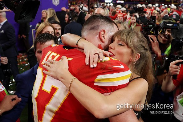 12일(한국시간) 미국 네바다주 라스베이거스 얼리전트 스타디움에서 열린 제58회 슈퍼볼 캔자스시티 치프스와 샌프란시스코 포티나이너스의 경기 종료 후 미국 팝스타 테일러 스위프트(오른쪽)가 그의 연인 트래비스 켈시(캔자스시티)와 우승의 기쁨을 나누고 있다.