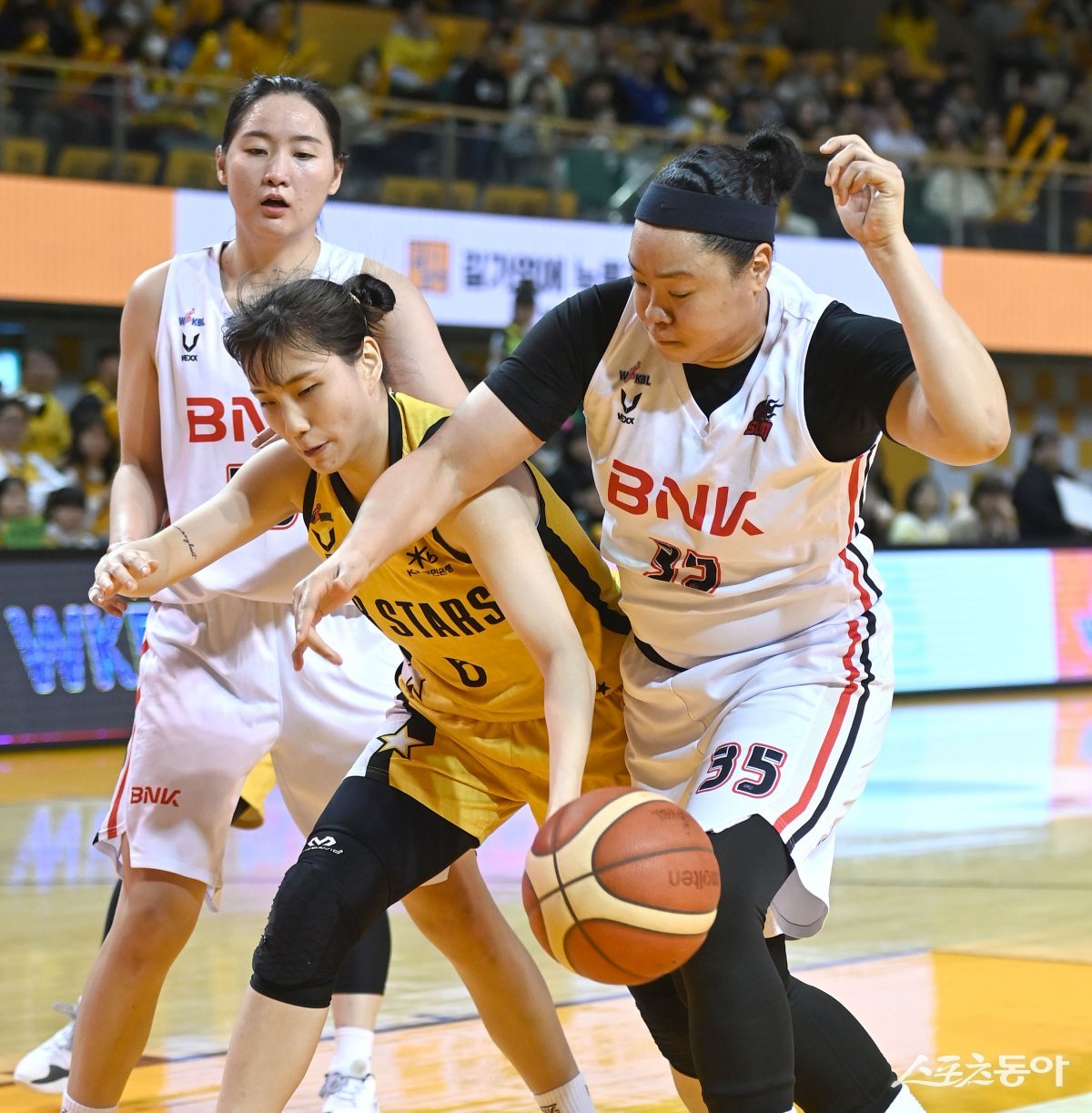 14일 청주체육관에서 열린 ‘우리은행 우리WON 2023~24 여자프로농구’ KB스타즈와 BNK 썸 경기에서 BNK 썸 김한별과 KB스타즈 이윤미가 루즈볼을 다투고 있다.
