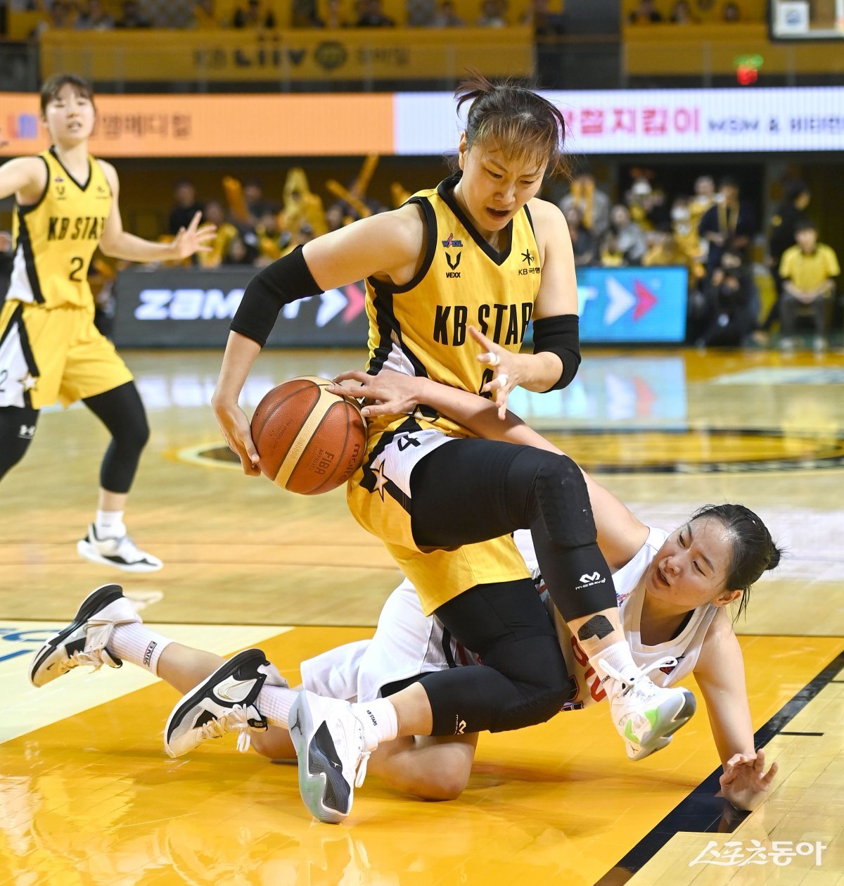 14일 청주체육관에서 열린 ‘우리은행 우리WON 2023~24 여자프로농구’ KB스타즈와 BNK 썸 경기에서 KB스타즈 염윤아와 BNK 썸 한엄지가 루즈볼을 다투고 있다.