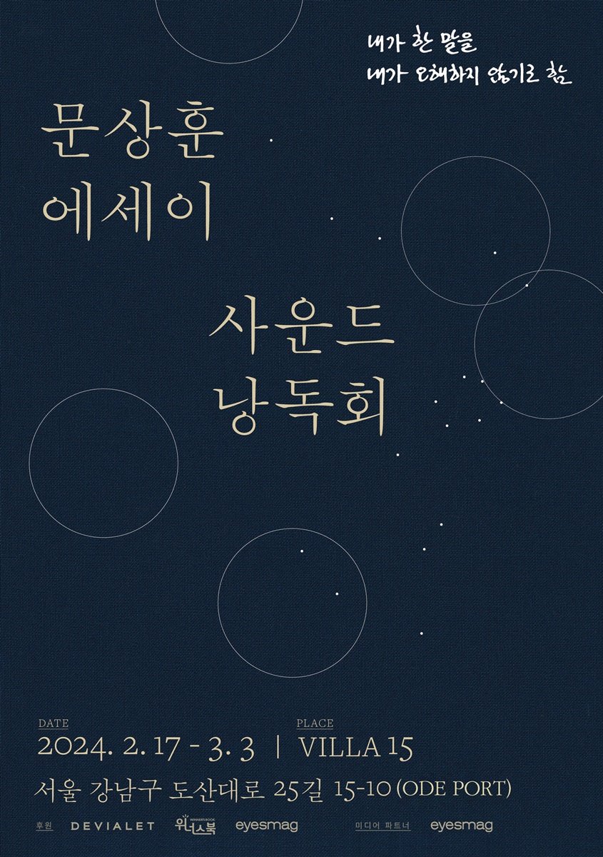 한편, 해당 사운드 낭독회는 2월 17일을 시작으로 3월 3일(2월 23일, 3월 1일 저녁 7시 문상훈 저자와 북토크 진행 / 매주 월요일 휴무)까지 @빌라15(오드 포트) 공간에서 진행된다. 멜론 티켓을 통해 단독 판매되며 낭독회 수익금은 전액 취약 아동 지원금으로 기부된다.