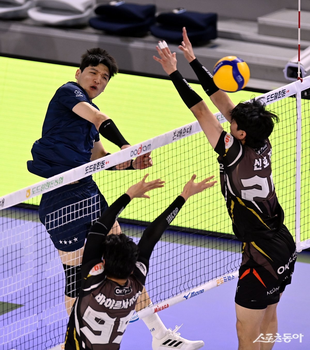 14일 인천 계양체육관에서 ‘2023-2024 도드람 V리그’ 인천 대한항공과 안산 OK금융그룹의 남자부 경기가 열렸다. 대한항공 정지석이 OK금융그룹 블로커를 피해 스파이크를 날리고 있다.