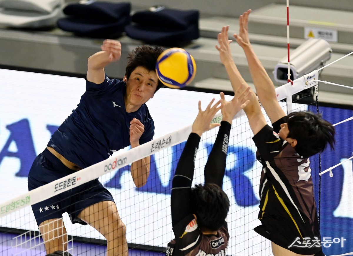 14일 인천 계양체육관에서 ‘2023-2024 도드람 V리그’ 인천 대한항공과 안산 OK금융그룹의 남자부 경기가 열렸다. 대한항공 곽승석이 OK금융그룹 블로커를 피해 스파이크를 날리고 있다.