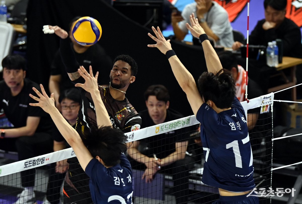14일 인천 계양체육관에서 ‘2023-2024 도드람 V리그’ 인천 대한항공과 안산 OK금융그룹의 남자부 경기가 열렸다. OK금융그룹 레오가 대한항공 블로커를 피해 스파이크를 날리고 있다.