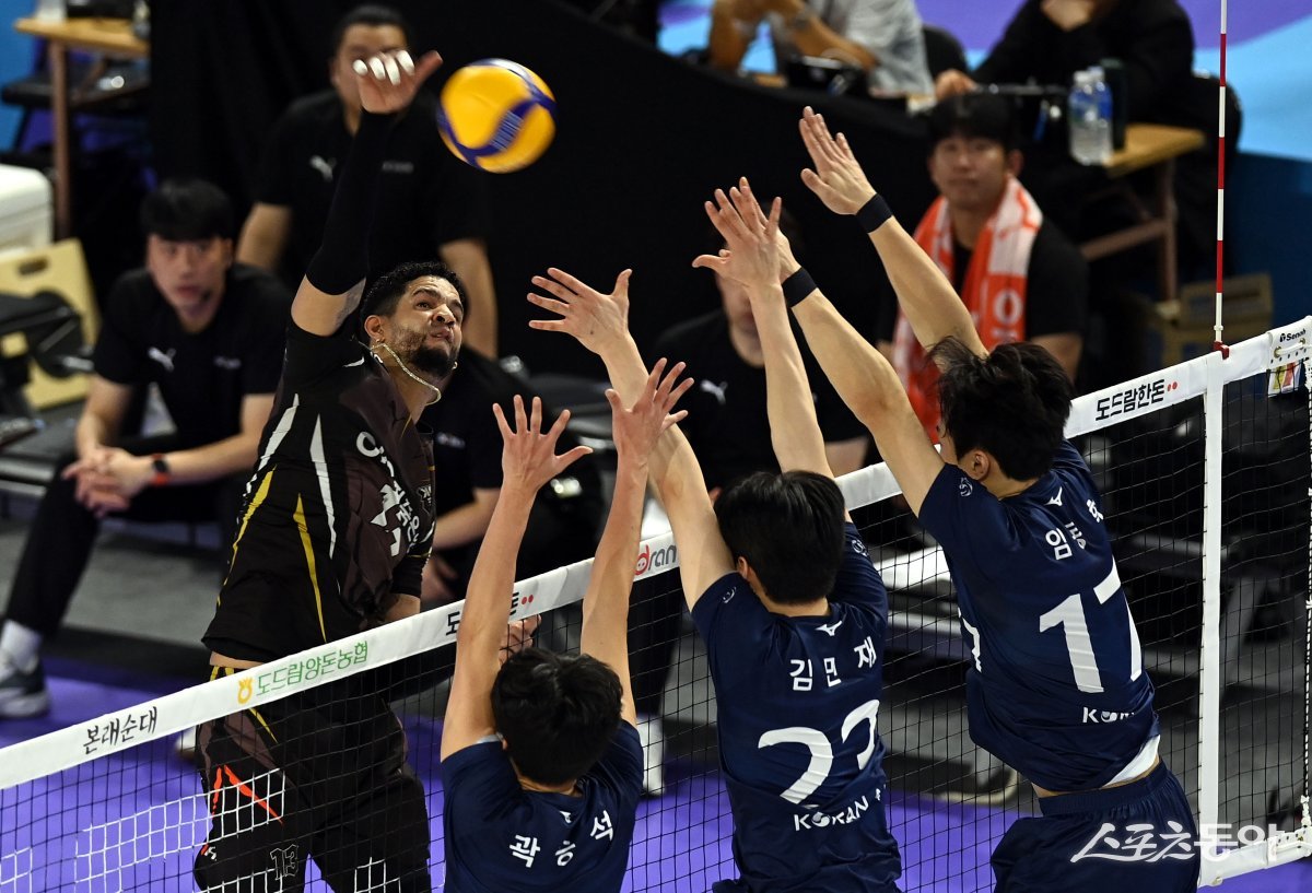 14일 인천 계양체육관에서 ‘2023-2024 도드람 V리그’ 인천 대한항공과 안산 OK금융그룹의 남자부 경기가 열렸다. OK금융그룹 레오가 대한항공 블로커를 피해 스파이크를 날리고 있다.