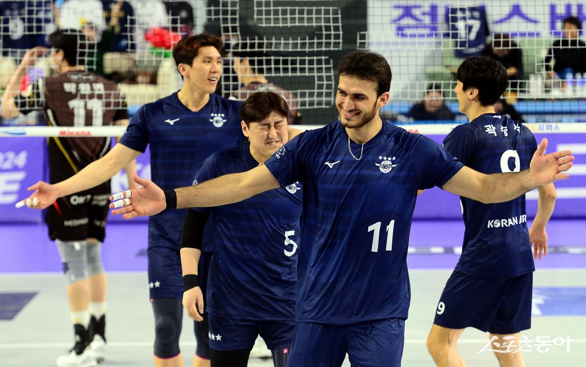 14일 인천 계양체육관에서 ‘2023-2024 도드람 V리그’ 인천 대한항공과 안산 OK금융그룹의 남자부 경기가 열렸다. 대한항공이 OK금융그룹을 상대로 세트스코어 3-1 승리 후 선수들이 코트에서 기쁨을 나누고 있다.