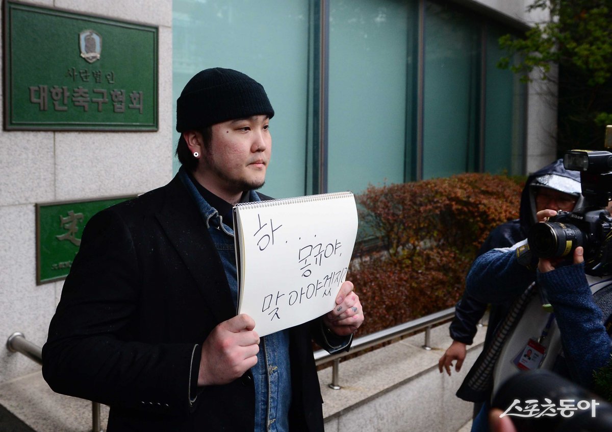 2023 카타르 아시안컵 4강 탈락으로 홍역을 겪는 대한축구협회의 ‘제1차 국가대표 전력강화위원회’가 15일 서울 종로구 신문로 축구회관에서 열렸다. 한 축구팬이 1인 시위를 하고 있다.