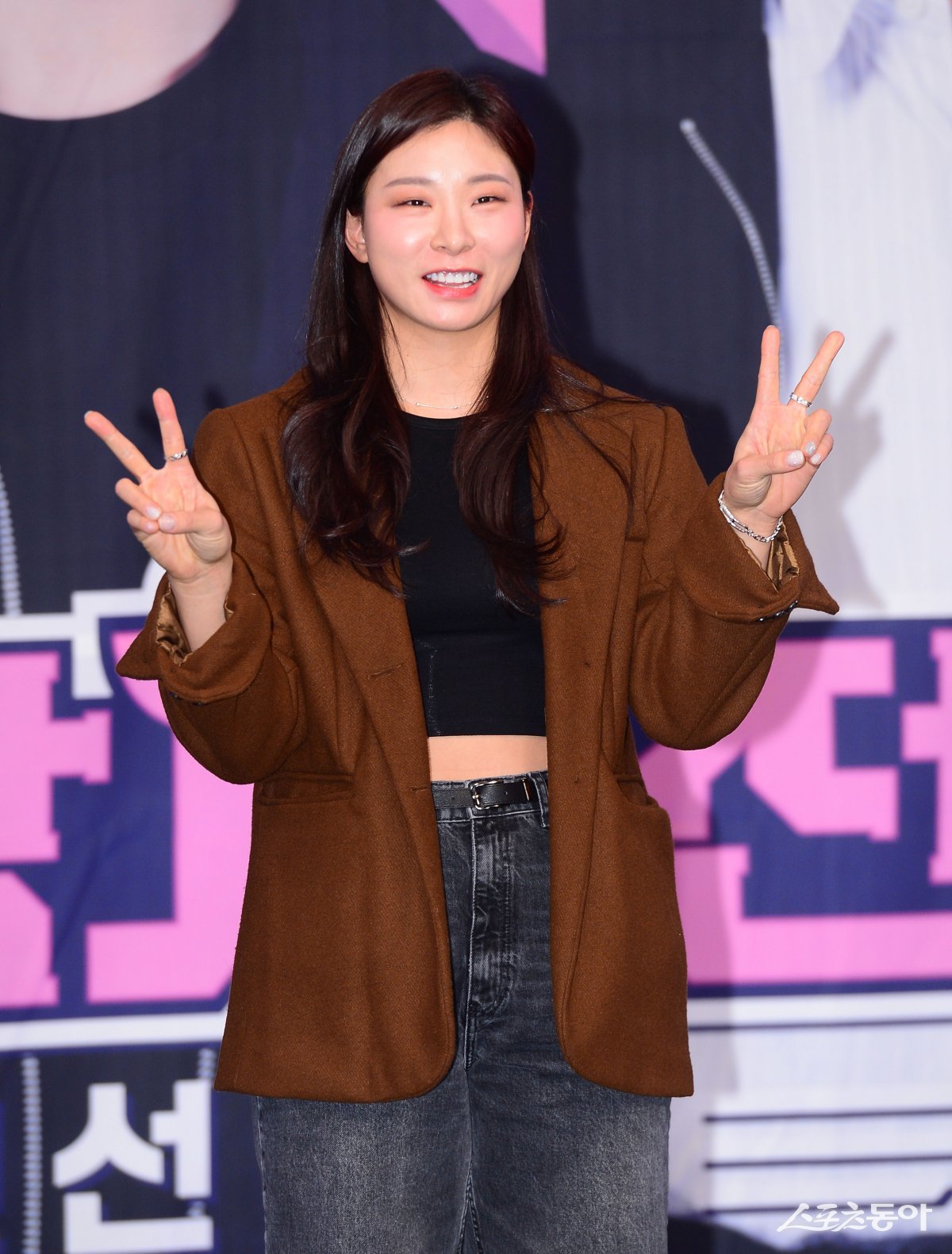 15일 서울 마포구 MBC 골든마우스홀에서 열린 MBC 새 예능 ‘대학체전 : 소년선수촌’ 제작발표회에 참석한 장은실이 카메라를 향해 포즈를 취하고 있다.