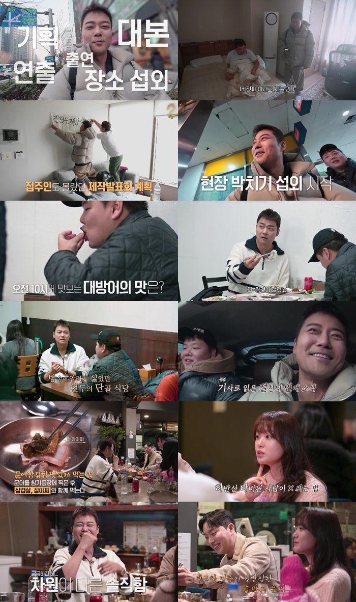 우선 전현무는 ‘리얼 길바닥 먹큐멘터리’라는 콘셉트에 맞게, 길바닥에서 홀로 셀프캠을 켠 뒤, “국내 최초로 기획, 연출, 출연, 대본, 장소 섭외 모두 저 혼자 한다”며 ‘전현무계획’의 출정을 알렸다. 이어 자신의 무계획 여행에 동참해줄 친구의 집으로 찾아갔는데, 비밀번호까지 누르고 자연스레 입장한 곳은 바로 ‘여행 유튜버’ 곽튜브의 집이었다. 침대에서 자다 깬 곽튜브는 퉁퉁 부은 채로 전현무에게 이끌려 거실에서 ‘즉흥 제작발표회’를 진행했고, 서둘러 씻은 뒤 무작정 길바닥으로 나섰다.