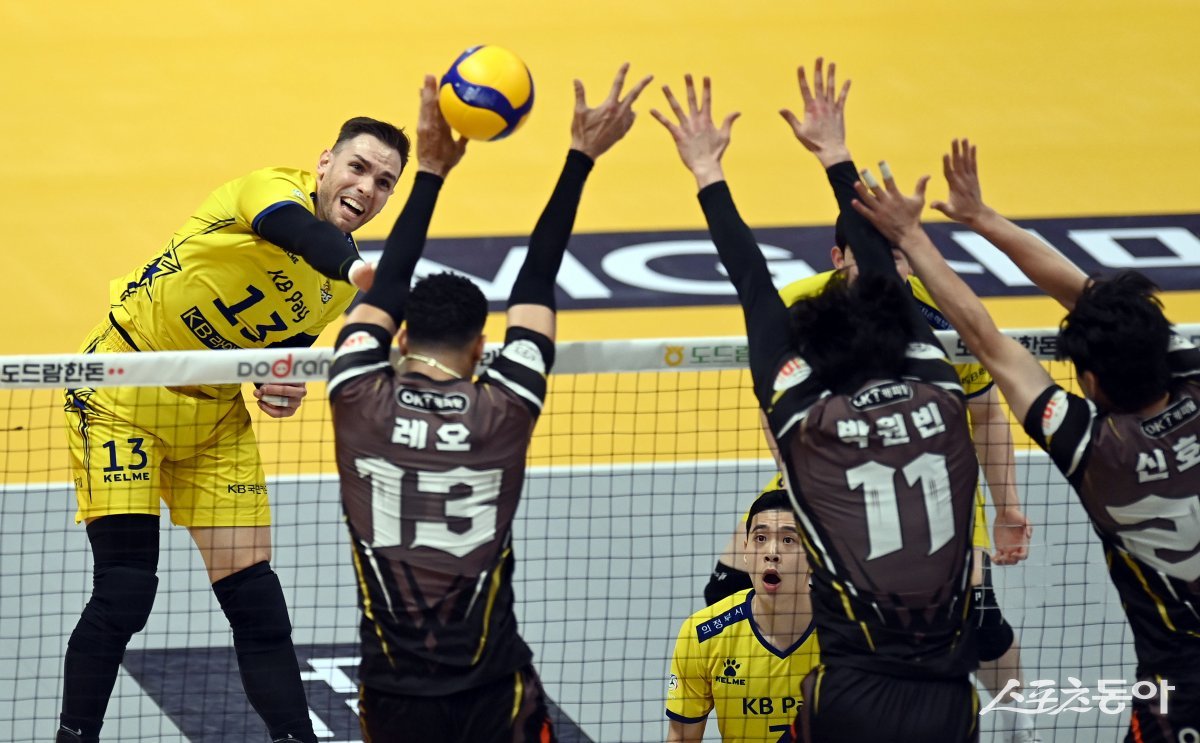 18일 의정부체육관에서 열린 ‘도드람 2023~2024 V-리그’ 남자부 KB손해보험과 OK금융그룹 경기에서 KB손해보험 비예나가 OK금융그룹의 블로킹 사이로 스파이크를 날리고 있다.