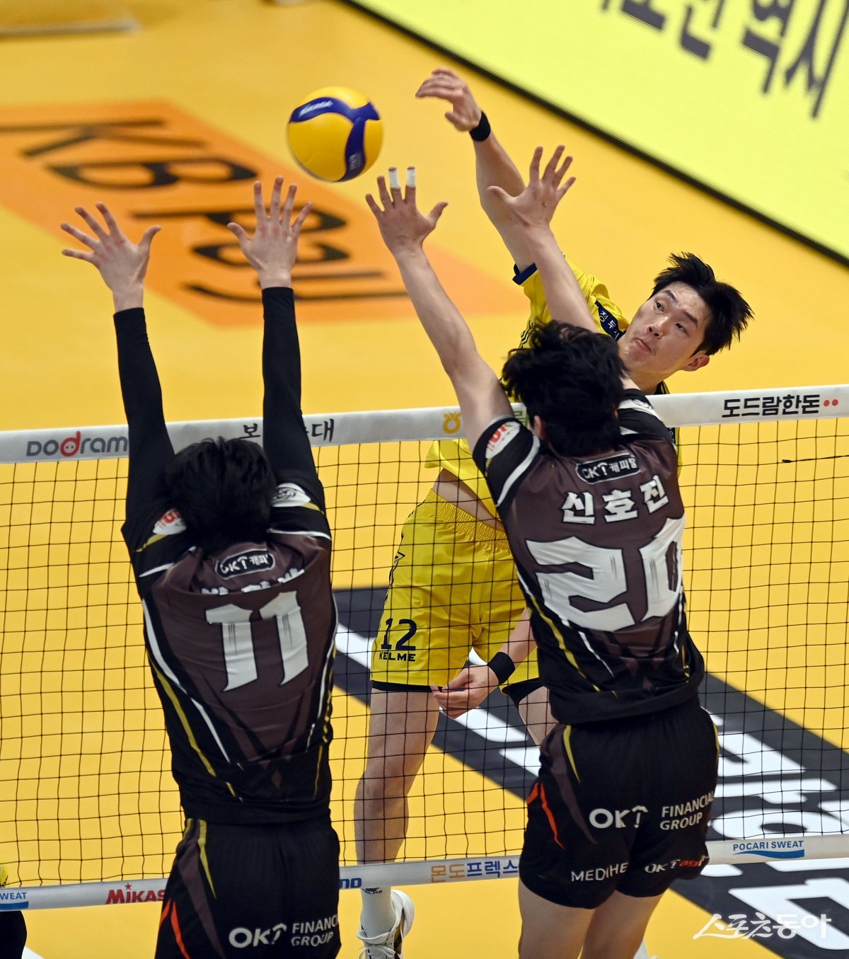 18일 의정부체육관에서 열린 ‘도드람 2023~2024 V-리그’ 남자부 KB손해보험과 OK금융그룹 경기에서 KB손해보험 황경민이 OK금융그룹의 블로킹 사이로 스파이크를 날리고 있다.