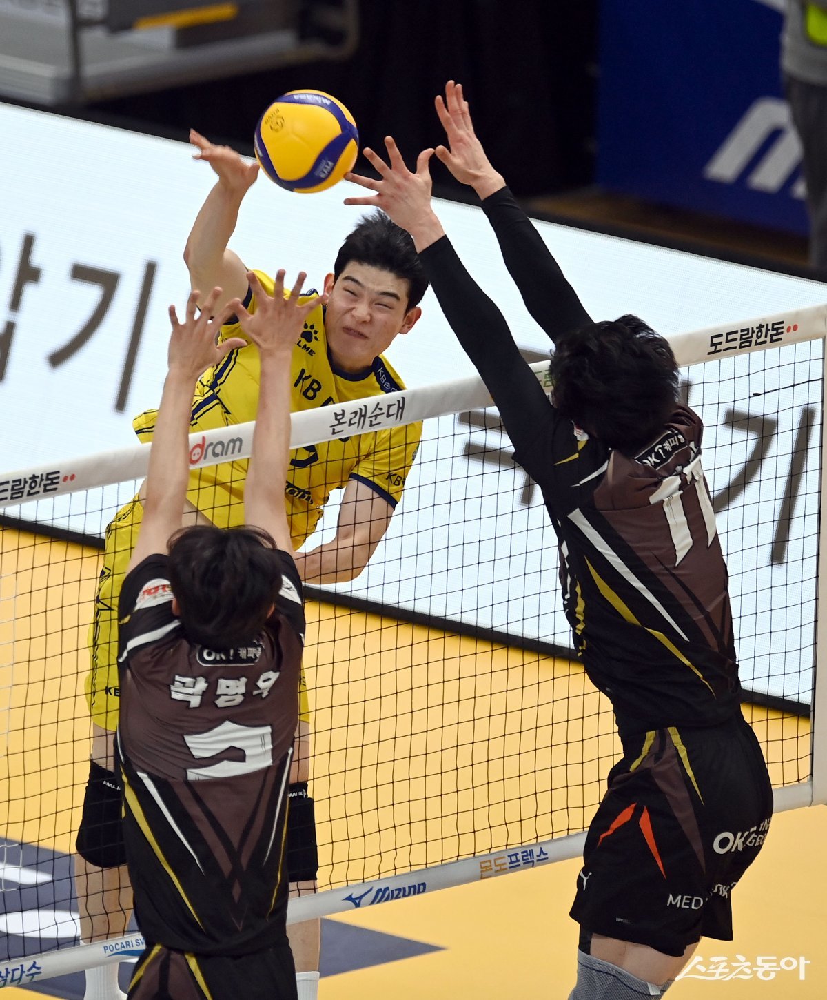 18일 의정부체육관에서 열린 ‘도드람 2023~2024 V-리그’ 남자부 KB손해보험과 OK금융그룹 경기에서 KB손해보험 홍상혁이 OK금융그룹의 블로킹 사이로 스파이크를 날리고 있다.