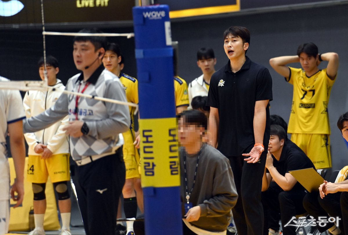 18일 의정부체육관에서 열린 ‘도드람 2023~2024 V-리그’ 남자부 KB손해보험과 OK금융그룹 경기에서 KB손해보험 김학민 감독대행이 판정에 항의하고 있다.